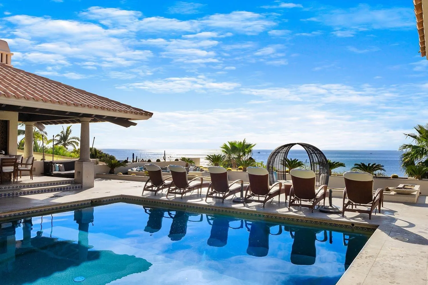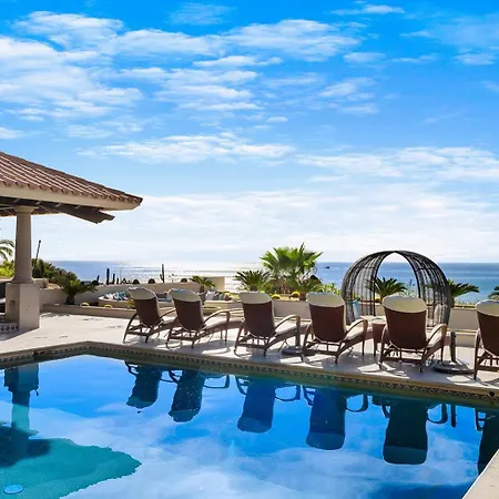 Die Villa in Cabo San Lucas bietet von einer Terrasse aus einen Küsten- Blick aufs Meer.